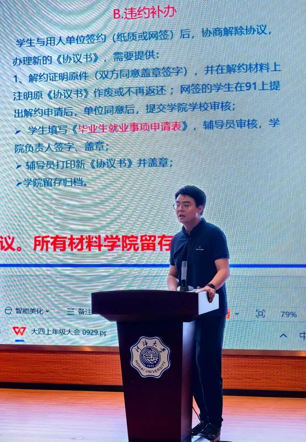 为更好地推进2025届毕业生就业与考研工作,鼓励学生积极就业,增强考研学子的必胜信心,近日,我院于科学会堂召开土木与交通学院2025届毕业生就业升学推进会。土木与交通学院党委副书记赵海伟,土木与交通学院本科2025届辅导员韩新禹,土木与交通学院本科2021级全体学生出席会议。此外,会议还邀请了上海建工一建集团、中建安装集团、中建东方装饰有限公司、中建一局集团一公司、中铁七局集团有限公司、中建八局集团轨道公司共8个行业重点优质单位参加。