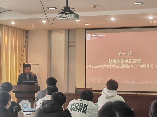 为弘扬茅以升先生“爱国、科学、奋斗、奉献”精神,践行茅以升工程教育思想,促进创新拔尖人才的培养,2024年11月18日,“茅以升班”授牌仪式在河海大学西康路校区科学馆516会议室隆重举行。土木与交通学院党委副书记赵海伟、2022级辅导员高建相、2022级地下建筑方向全体同学参加。