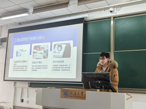 随即,2024级年级学习委员任一哲同学对年级期中考试情况进行分析,基于不合格率、平均分等数据,将各班同科目成绩进行横向对比,帮助同学们明定位,找差距。在此基础上,邓瑞华老师进一步指出当前年级中存在的学风问题,如部分同学缺乏明确的学习目标、自律性较差、朋辈交流不足等,要求同学们自查自省,及时改进。