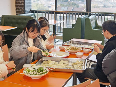 下午四点整,包饺子活动正式开始,食堂工作人员迅速为各小组分发食堂备好的食材与工具,同学们围坐桌边,分工协作、互帮互助,有的均匀放馅,有的认真捏合,一张张饺子皮在手中快速变成形态规整的饺子,餐盘里很快堆满了鼓鼓囊囊的成果,现场一派热火朝天的温馨景象。